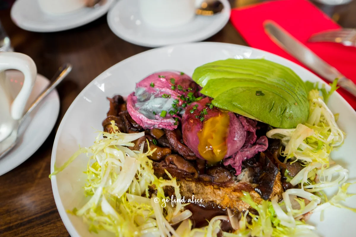red wine poached eggs - pearl onions - mushrooms - bacon - toasted brioche